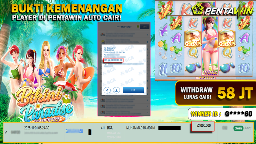 Bukti Kemenangan Dan Withdraw 01 NOVEMBER 2025 Di Game bikini paradise WD 58 JUTA