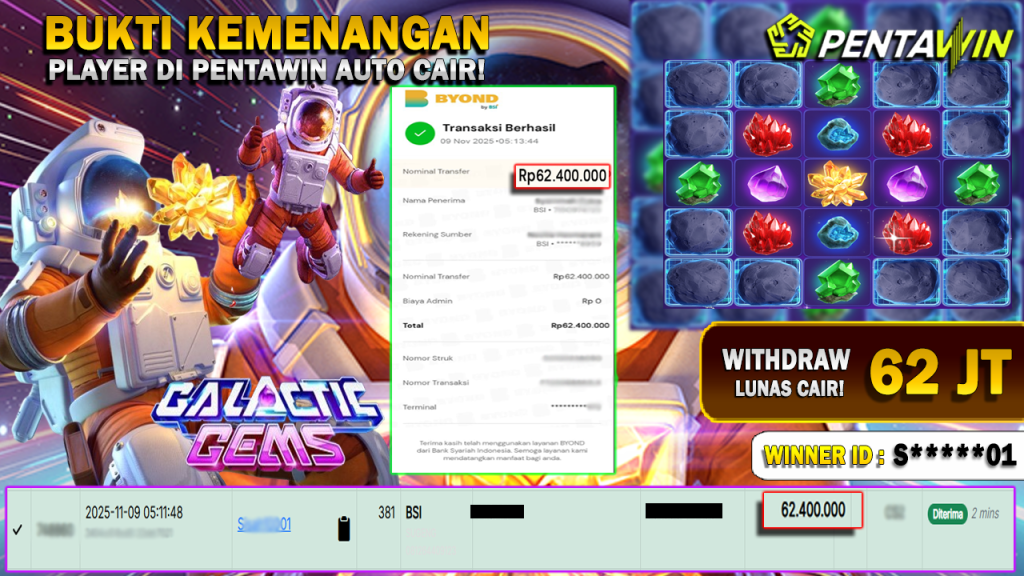 Bukti Kemenangan Dan Withdraw 09 NOVEMBER 2025 Di Game Galactic Gems WD 62 JUTA