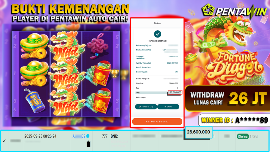 Bukti Kemenangan Dan Withdraw 23 SEPTEMBER 2025 Di Game fortune dragon Wd 26 Juta