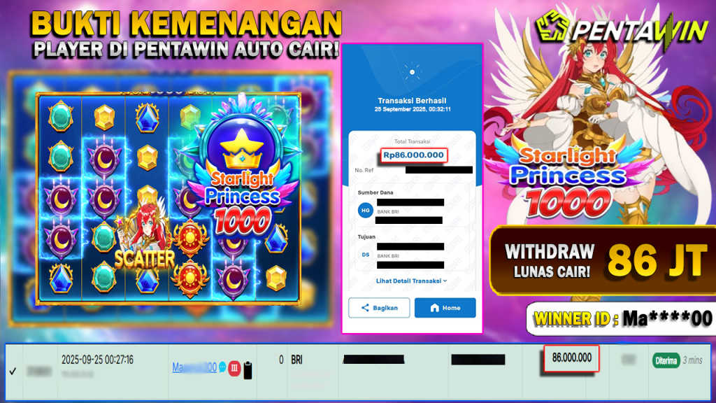 Bukti Kemenangan Dan Withdraw 25 SEPTEMBER 2025 Di Game Starlight Princess 1000 Wd 86 Juta