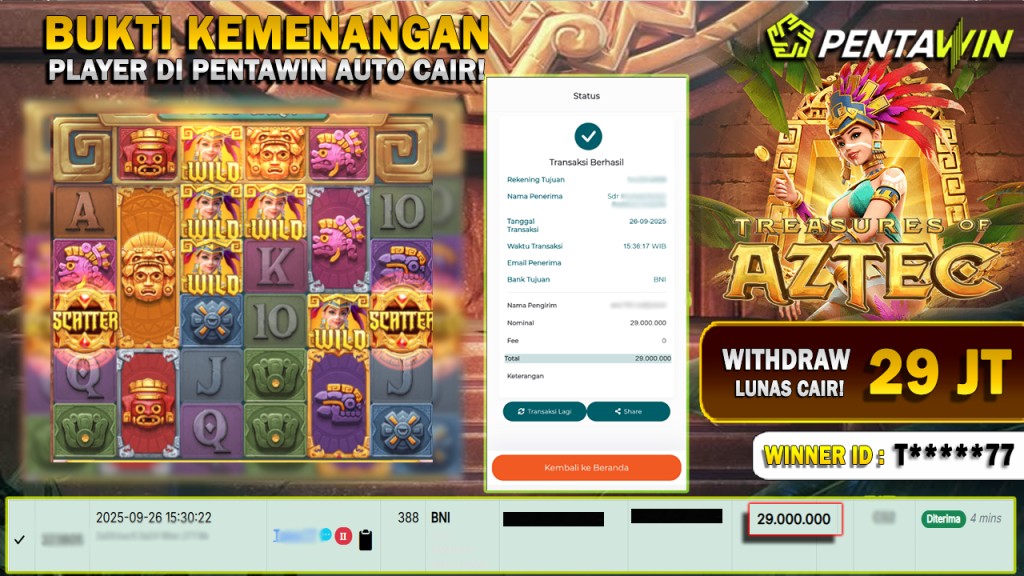 Bukti Kemenangan Dan Withdraw 26 SEPTEMBER 2025 Di Game Treasures of Aztec WD 29 JUTA
